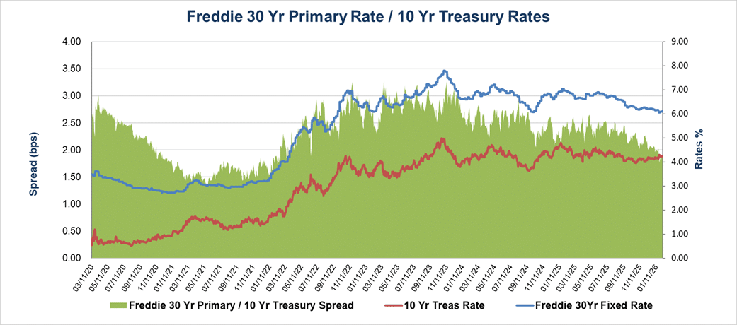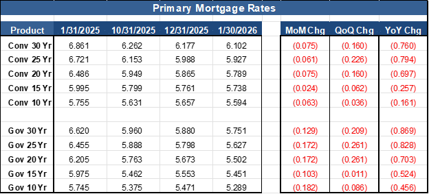 Mortgage rates have edged slightly lower from their December 31, 2025 marks. MCT’s Primary 30 Year mortgage rate declined by seven and a half (7.5) basis points to 6.102%.