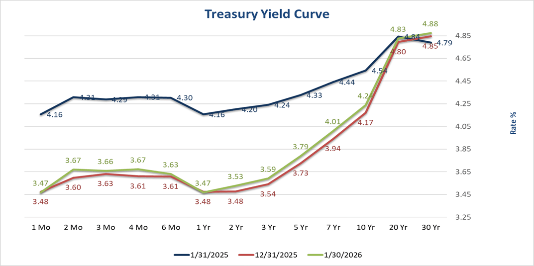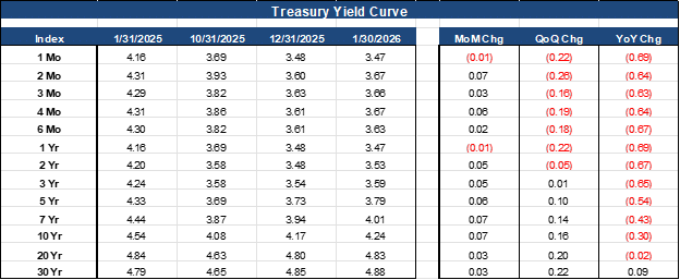 The yield on the benchmark 10-year Treasury is at 4.24%, seven (7) basis points higher than the prior month. The current yield curve remains steep reflecting investors’ continued demand for higher yields due to the current economic uncertainty.