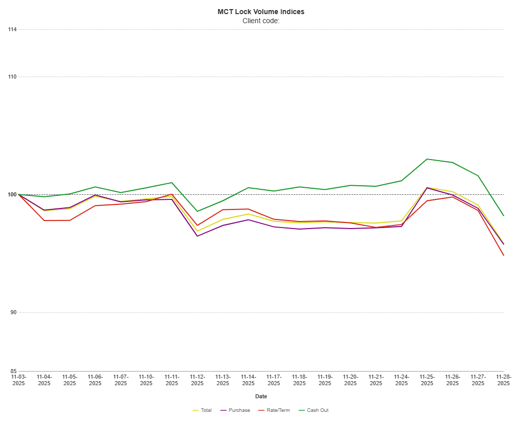 MCT remains committed to delivering expert guidance and data-driven insights. MCT’s Lock Volume Indices present a snapshot of rate lock volume activity in the residential mortgage industry broken out by lock type (purchase, rate/term refinance, and cash out refinance) across a broad diversity of lenders (e.g., sizes, products/services offered, business models) from MCT’s national footprint.