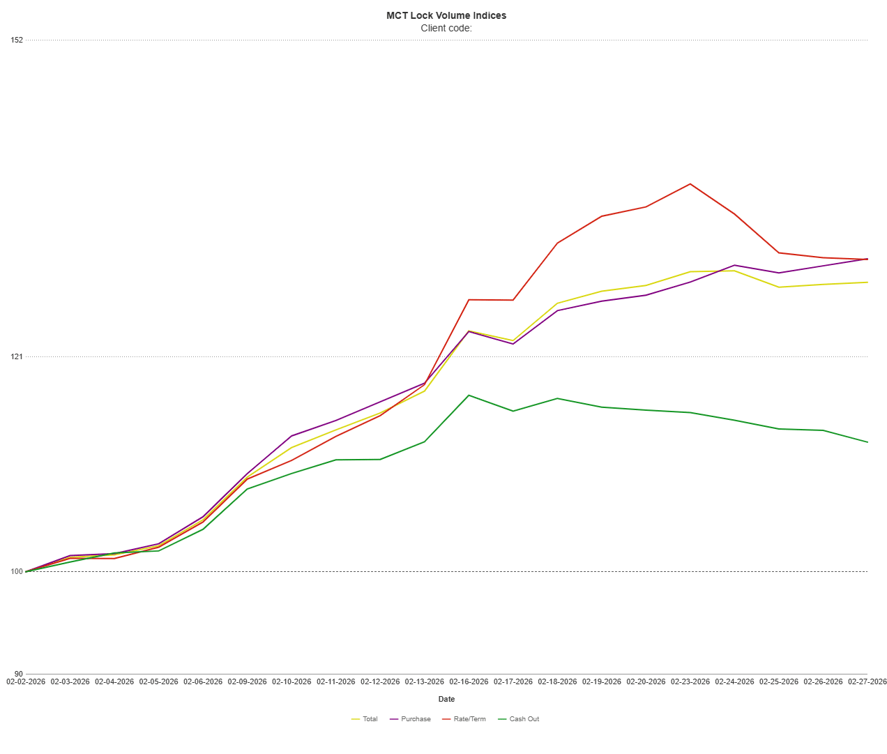 MCT remains committed to delivering expert guidance and data-driven insights. MCT’s Lock Volume Indices present a snapshot of rate lock volume activity in the residential mortgage industry broken out by lock type (purchase, rate/term refinance, and cash out refinance) across a broad diversity of lenders (e.g., sizes, products/services offered, business models) from MCT’s national footprint.